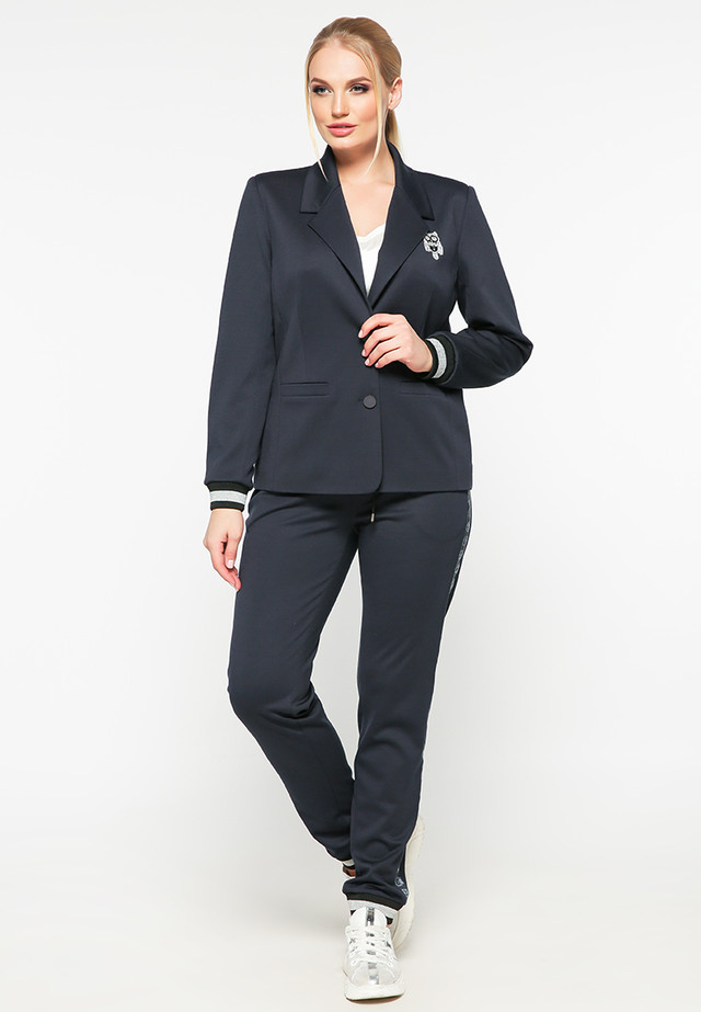 Костюм, що складається з жакета та штанів у стилі "міської спорт-шик". Жакет класичного вигляду з елементами спортивного крою. Однобортний на два ґудзики, з класичною формою комірами лацкана з округлим бортом. На пілочці бочок плюс нагрудно-талева виточка з кишені-листочки (обманка) по пілочці. На лівому боці грудей декоративна клейова совочка з каменів "Swarovski". Спинка з центральним швом і рельєфами. Силует напівприталений. Рукав помірно-вільний двошовний з манжетою з дов'язу (чорний + срібло). Жакет на підкладці. Штани помірно-вільного крою з декоративними лампасами: ексклюзивні совоньки. Кишені косі, гульфик-обманка. Пояс вільний пришивний на широкій внутрішній гумці, з декоративною нашивкою по центру пояса з холітенами та наскрізним шнурком. На задній лівій половинці штанів кишеня. Низ штанів на манжеті-дов'язі. Тканина — якісне джерсі.