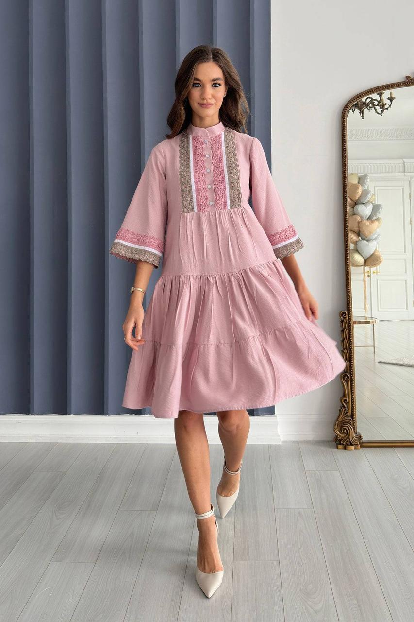 - Тканина: Виготовлена з високоякісного поєднання льону (45%), віскози (35%) та поліестеру (20%), ця сукня поєднує в собі природність, м'якість та довговічність.