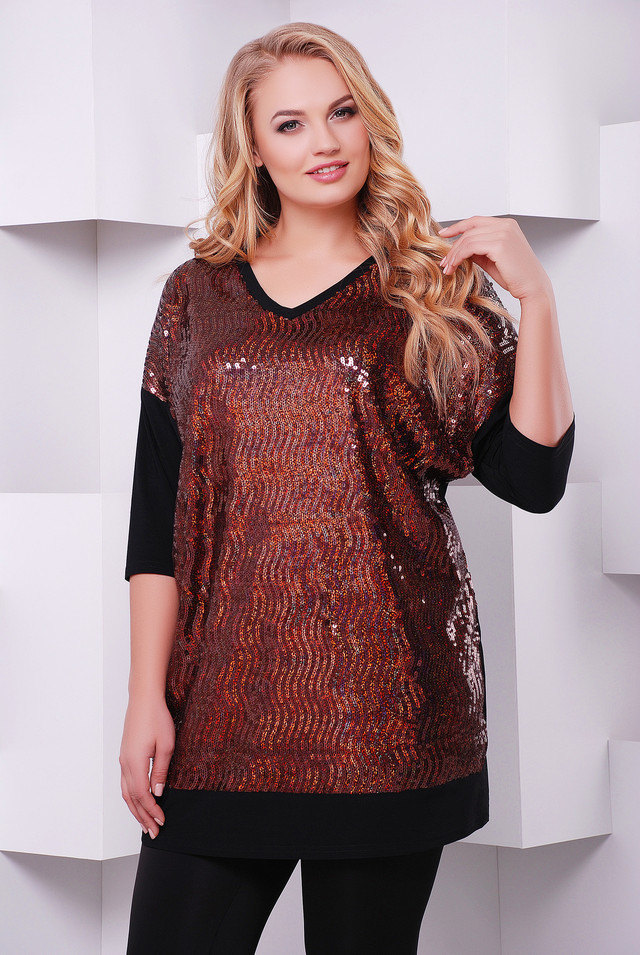 Ошатна туніка з заниженою проймою і рукавом 3/4 для святкового вечора з паєтками великого розміру 54-60